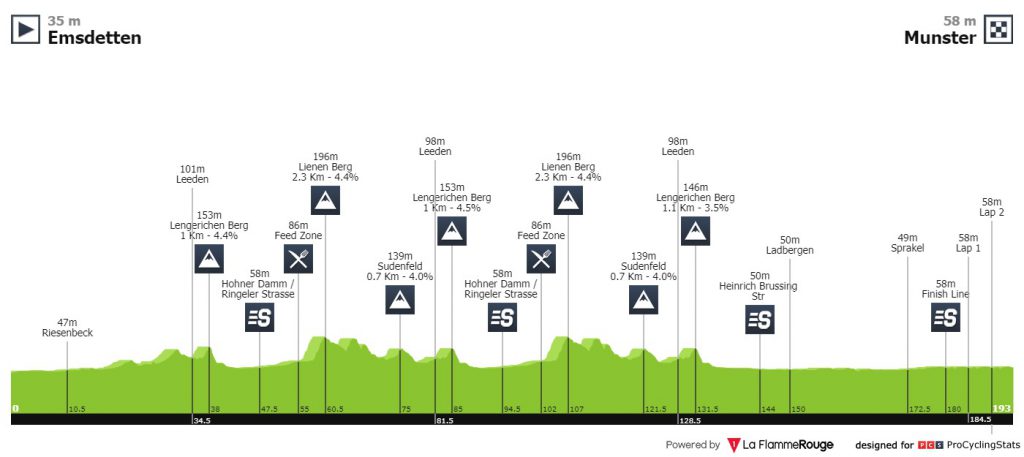 La prueba que en sus kilómetros iniciales presenta siete cotas montañosas de menor dificultad, como es habitual en este tipo de competencias se cumplirá sobre 193 kilómetros de distancia entre las localidades de Emsdetten y Münster.