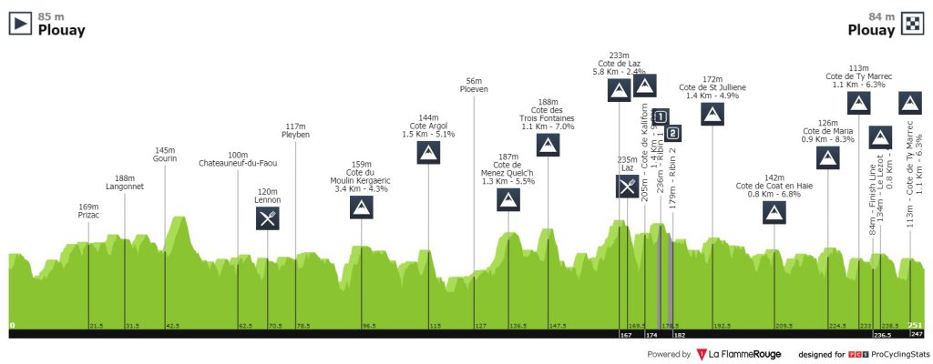 La competencia que parte y arriba en Plouay. Tendrá paso por doce cotas montañosas a lo largo de los 248 kilómetros que recorrerán los corredores.