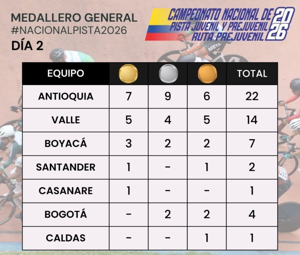 Segundo día en el Campeonato Nacional de Pista Prejuvenil y Juvenil 2026, que se disputa en Bucaramanga, y sigue el mano a mano entre Antioquia y el Valle del Cauca, que sumó tres medallas de oro, ratificando su protagonismo en el certamen.