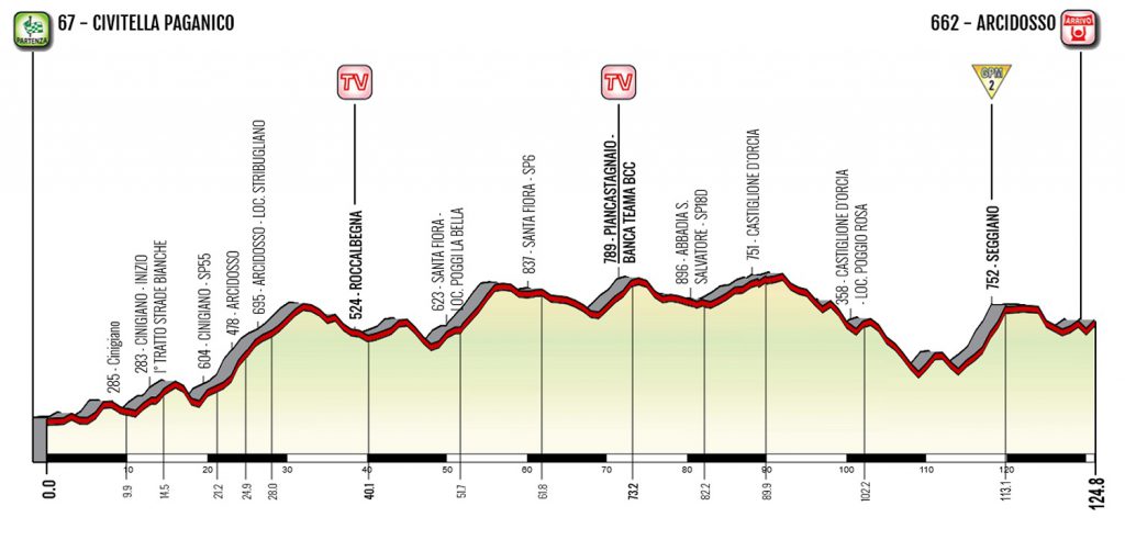 La fracción de apertura será una contrarreloj por equipos de 16.8 kilómetros en Grosseto, prueba que servirá como filtro inicial para las aspirantes a la disputa del título. En la segunda jornada aparece la gran montaña, destacándose el ascenso a Seggiano, escalada que concluye a diez kilómetros de meta en Arcidosso.