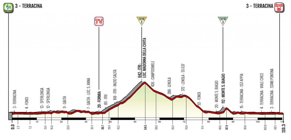 En la tercera y cuarta etapa aparece la montaña con dos llegadas en ascenso, inicialmente en Assisi y posteriormente en Tivoli, jornadas que serán cruciales para la disputa de las posiciones de privilegio, previas a la quinta jornada que se cumplirá en Terracina y presenta una dificultad montañosa en la parte intermedia del recorrido.