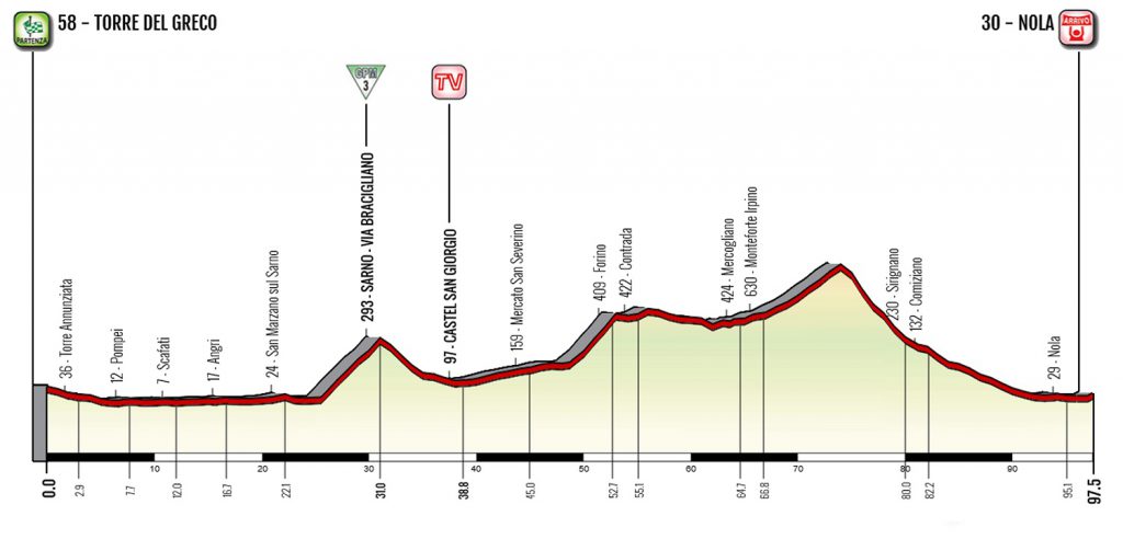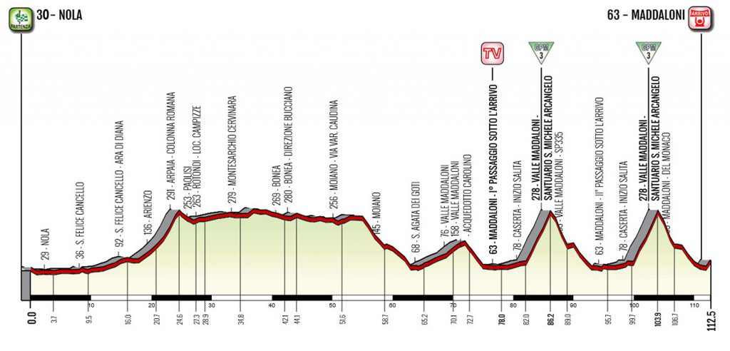 La sexta etapa nuevamente presenta un terreno ondulado, en los 97 kilómetros de recorrido hasta el arribo en Nola. En la séptima jornada, la doble escalada al Santuario Saint Michele Arcangelo será uno de los grandes atractivos, ascensión de cuatro kilómetros que está ubicada a nueve kilómetros de la llegada en Maddaloni.