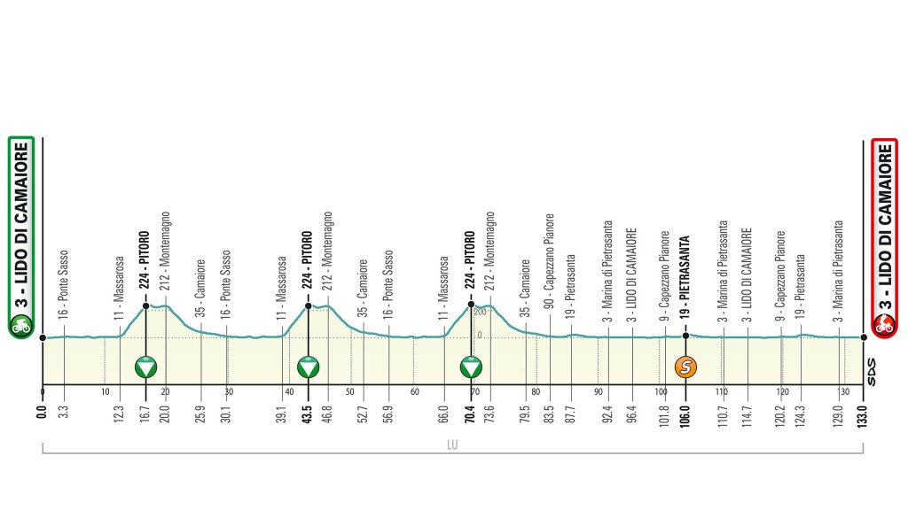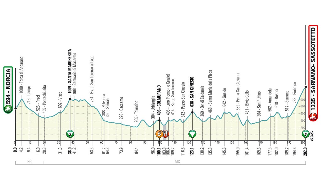 Posición de privilegio que seguramente tendrá variantes en la cuarta jornada, en la que se presentan tres ascensiones de gran importancia; la última de ellas a doce kilómetros de la línea de meta en Cascia. Mientras que en la quinta fracción aparece la primera llegada en alto, luego de ascender tres escaladas concluyendo en Sarnano Sassotetto con una escalada de 14.2 km al 5.8%.