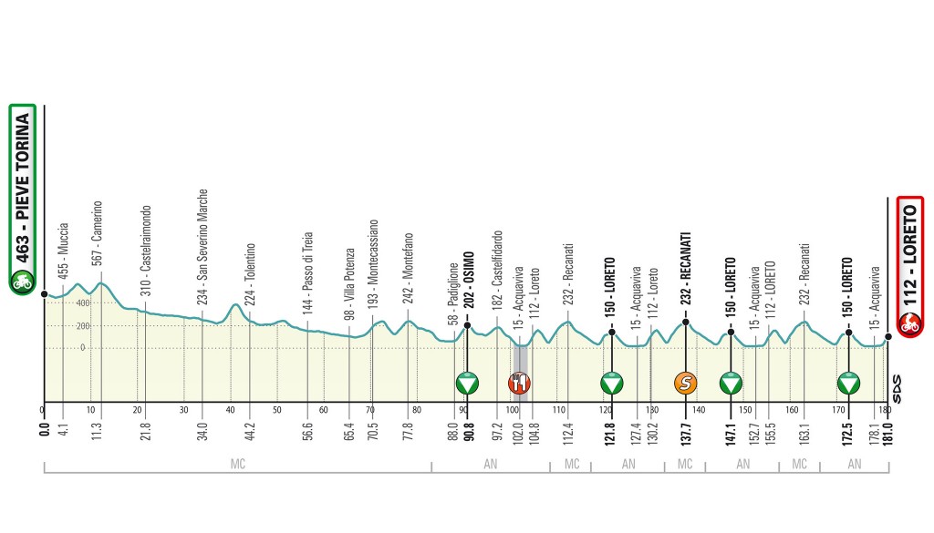 En la sexta fracción, nuevamente los velocistas tendrán una gran posibilidad de luchar por el triunfo en una jornada de 171 kilómetros con arribo en Senigallia. Mientras que en la séptima etapa con tres ascensiones a Loreto, la clasificación general se perfilará de cara a la contrarreloj individual final de diez kilómetros en San Benedetto del Tronto.