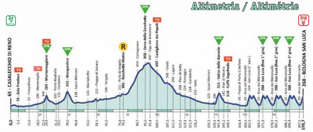 Escenario a donde llegan los grandes vencedores del Giro de Emilia después de 199 kilómetros de difícil trazado en línea y un circuito urbano final de de 3 vueltas que incluye también el pasaje en 3 oportunidades por el icónico santuario.