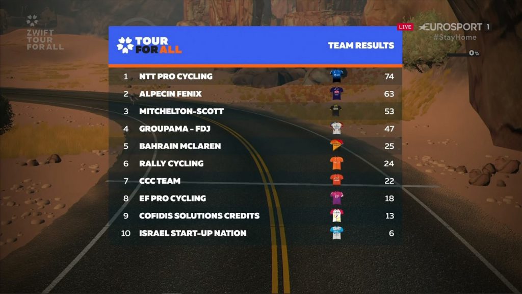 Por su parte el NTT Pro Cycling conserva el liderato con 74 puntos, sobre los 63 del Alpecin Fenix y los 53 del Mitchelton Scott, que ocupan la segunda y tercera posición respectivamente.