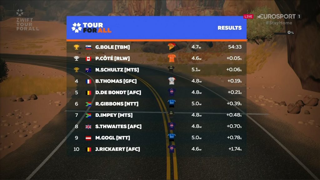 En una agónica definición al sprint, el esloveno Grega Bole (Bahrain McLaren) se adjudicó la victoria en la cuarta y penúltima jornada del ‘Tour For All’ que se cumplió este jueves sobre una distancia de 42.6 kilómetros en Arenas & Secuoyas de Watopia.