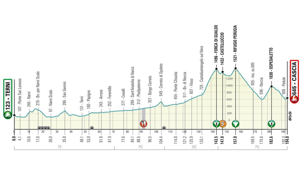 Este miércoles en la cuarta jornada que parte de Terni y recorrerá 194 kilómetros, aparece la alta montaña en esta prueba. Jornada que presenta tres ascensiones de gran dificultad, la última de ellas concluye a doce kilómetros de meta en Cascia.