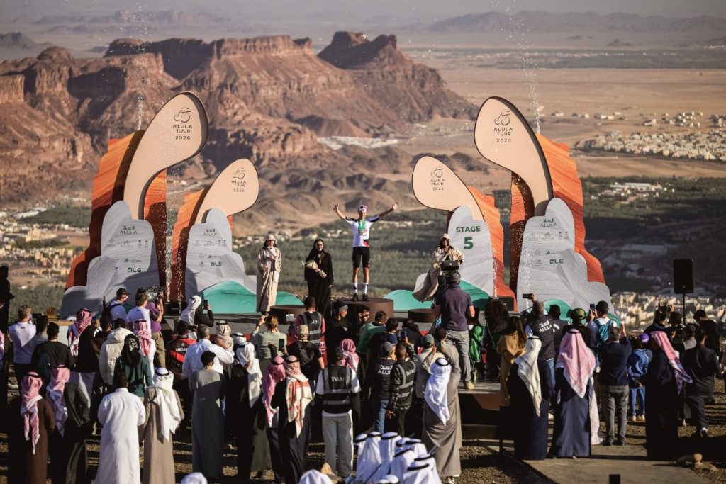 Jan Christen, en el podio del AlUla Tour 2026. (Foto © AlUla Tour)