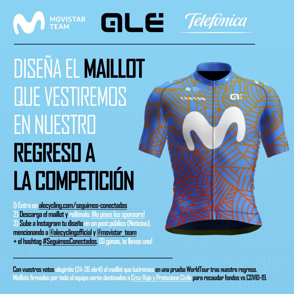 El maillot elegido por los aficionados será utilizado por Alé, partner técnico oficial de Movistar Team, para diseñar la pieza que los ciclistas vestirán en una carrera del UCI WorldTour tras su regreso. El ganador se llevará una prenda de dicha serie limitada. Los maillots, firmados por toda la plantilla, serán puestos a disposición de Cruz Rojay la ProtezioneCivile italiana, para que con los fondos obtenidos de los mismos la organización pueda continuar su lucha para paliar las consecuencias del coronavirus. Las bases legales y mecánica de participación estarán disponibles en todo momento aquí.