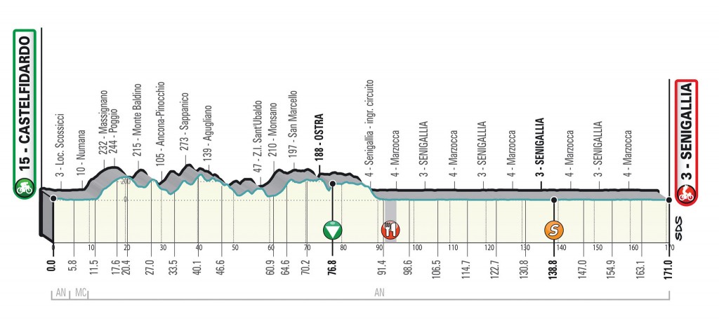Este sábado los velocistas tendrán una importante posibilidad de luchar por el triunfo, en una sexta jornada que no presenta ascensiones categorizadas y se cumplirá sobre 171 kilómetros entre Castelfidardo y Senigallia.