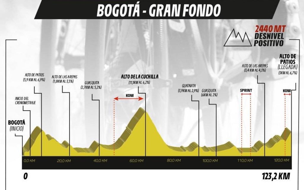 La carrera estará dividida en tres recorridos: el Gran Fondo, el Medio Fondo y el Pequeño Fondo. El primero comprende una distancia de 126 kilómetros y cuatro premios de montaña, que empezarán su curso en la carrera séptima y finalizarán en el tradicional Alto de Patios, con paso intermedio de suma exigencia por el Alto de la Cuchilla, premio de primera categoría. El segundo consta de una distancia 96 kilómetros entre la carrera séptima, Guasquita, Guatavita y Patios. El tramo de menor exigencia recorrerá 55 km.
