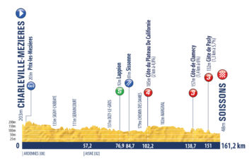 La primera etapa en línea de esta prueba partirá de Charleville-Mézières rumbo a Soissons. Jornada de 161 kilómetros con paso por un puerto de cuarta y dos de tercera categoría, -el último de ellos ubicado a 10 Km del arribo-, donde se prevé una definición entre los velocistas.