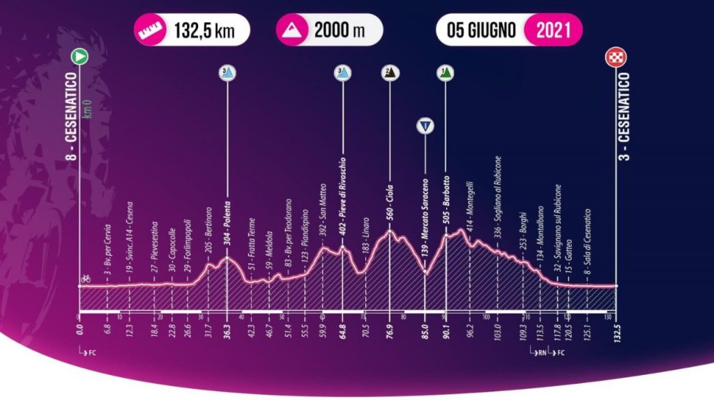Con partida y arribo en Cesenatico, este sábado se cumplirá la tercera fracción de la ‘Corsa Rosa Sub 23’, jornada de 132 kilómetros en la que aparece la alta montaña y tendrá paso por dos puertos de tercera, uno de segunda y uno de primera categoría, encadenados en la parte intermedia del recorrido, antes de los 40 kilómetros finales con tendencia al descenso.