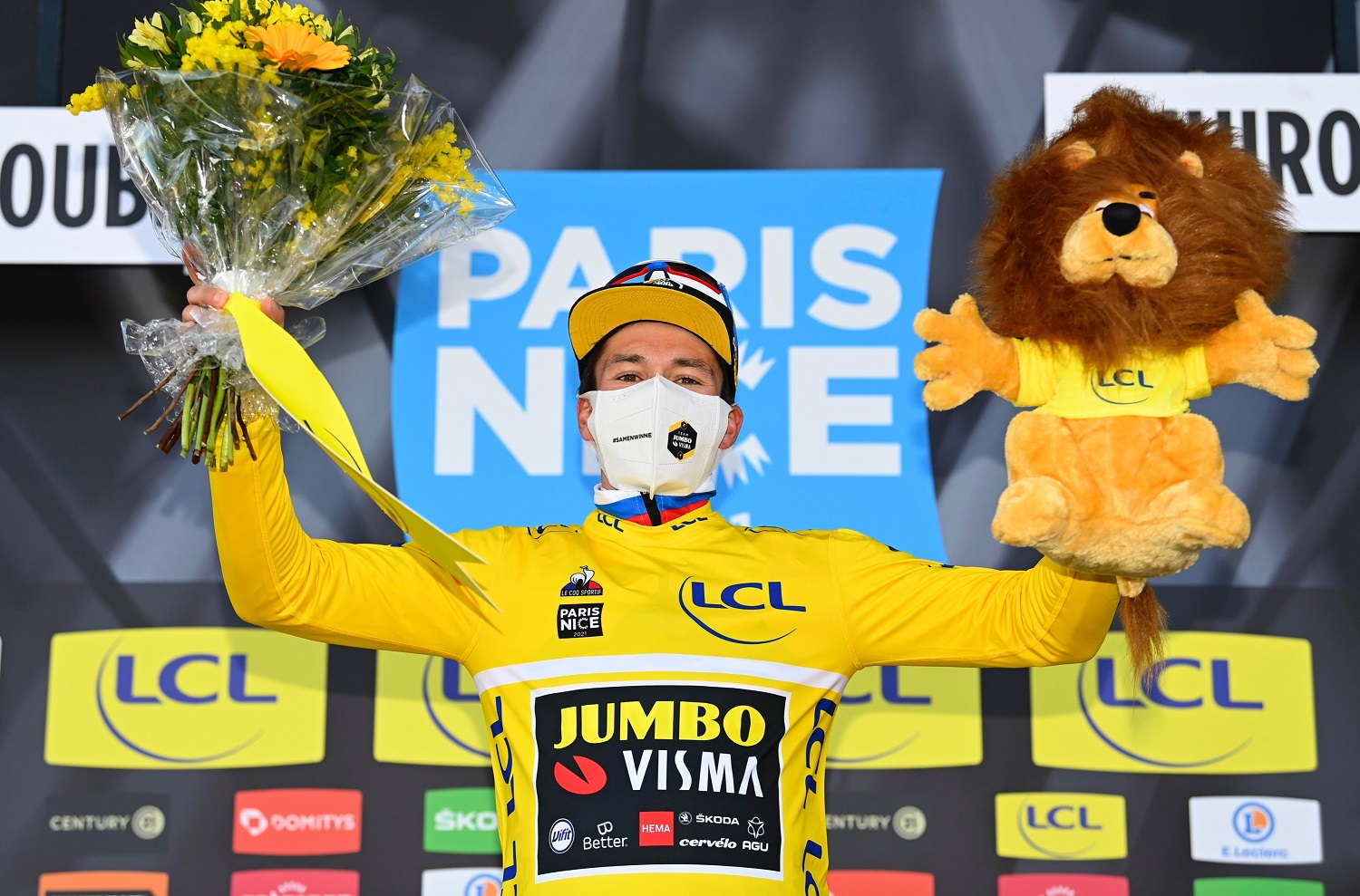 Primož Roglic en el podio de la cuarta etapa como líder de Paris-Niza 2021 (Photo©Jumbo Visma)