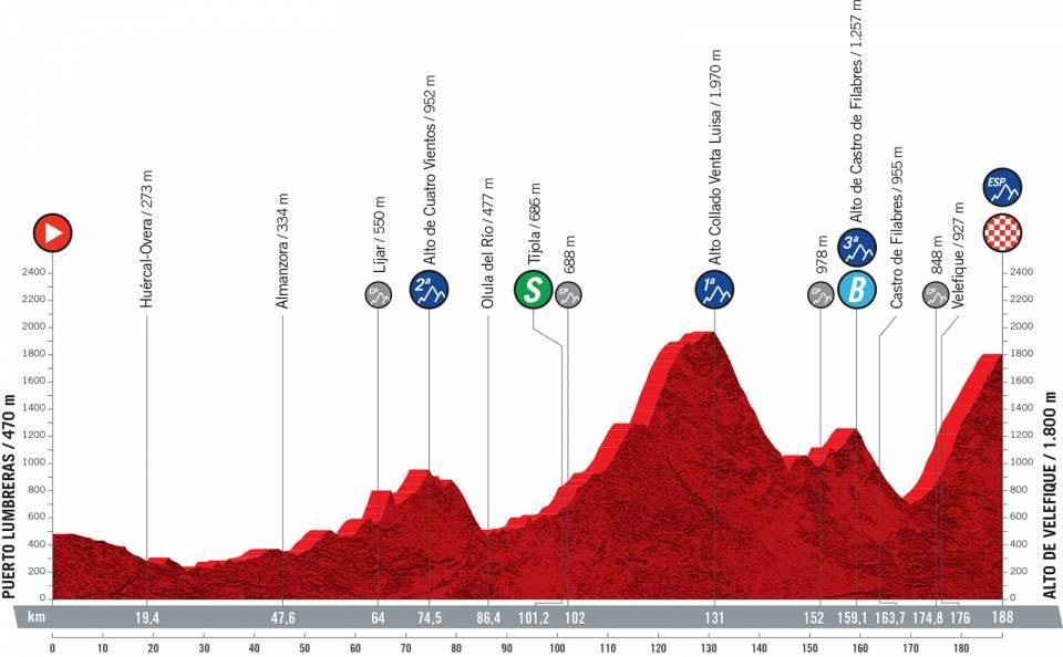 Una de las etapas más exigentes de la Vuelta se cumplirá este domingo con partida en Puerto-Lumbreras. Fracción de 188 kilómetros con paso por un puerto de segunda, uno de primera, uno de tercera, para finalizar en el Alto de Velefique, escalada de categoría especial con 13.2 Km al 6.4 % de exigencia.