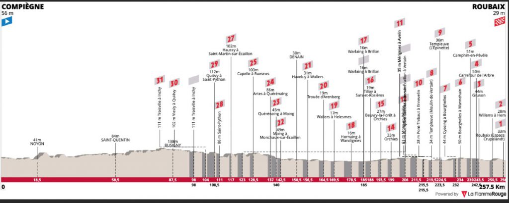 La ‘Clásica de Clásicas‘ cubrirá este año 257,7 kilómetros, de los cuales 55 kilómetros son adoquines, repartidos en treinta secciones.