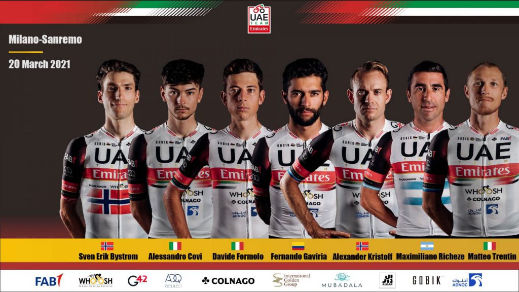 Este jueves el UAE Team Emirates presentó su nómina oficial para la disputa de Milano-Sanremo este sábado, entre los elegidos en el conjunto emiratí para la disputa de ‘La Classicissima’ aparece el velocista colombiano Fernando Gaviria.