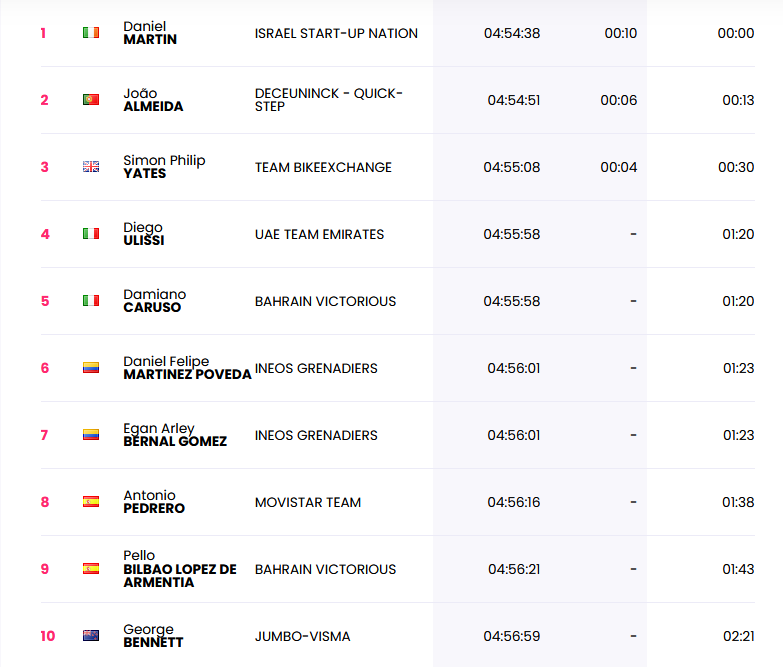 En la escalada final, Dani Martin juega sus restos y resiste hasta conseguir la victoria mientras atrás el lote líder con unos 20 integrantes estuvo al mando del INEOS blindando a su capitán Egan Bernal para desembocar finalmente en un duelo entre Martin y un cuarteto integrado por Yates, Bernal, Martinez y Almeida del cual salió ganador Yates quien se fue del lado de Egan y consiguió descontar 54 segundos subiendo al tercer lugar del podio a 3.27 de Bernal quien acusó un momento de crisis en los últimos kilómetros que logró superar.