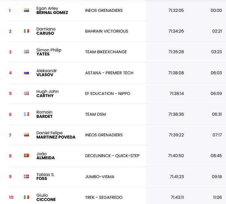 En cuanto a los colombianos, el mejor de los nuestros fue el huilense Harold Tejada (XDS Astana Team) en la casilla 21° justo detrás del belga Remco Evenepoel (Red Bull – BORA – hansgrohe), ambos con el mismo tiempo del ganador.
