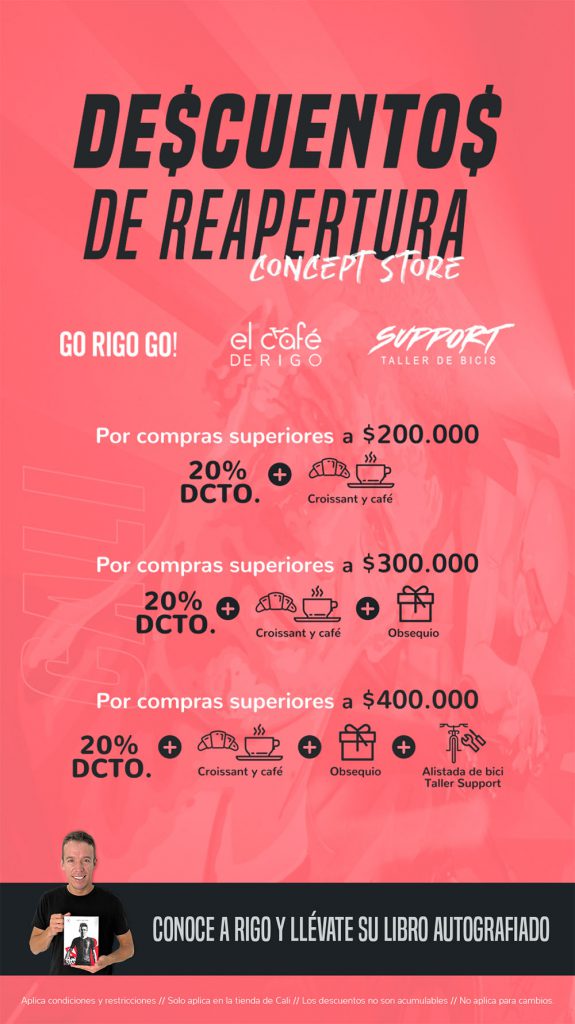 La reapertura de GO RIGO GO en la capital del Valle del Cauca viene llena de descuentos por compras superiores a $200.000 pesos. Más actividades con DJ, degustaciones y la posibilidad de conocer a Rigoberto Urán en persona, llevarse una foto con él y una copia autografiada de su biografía “RIGO” escrita por Andrés López López.