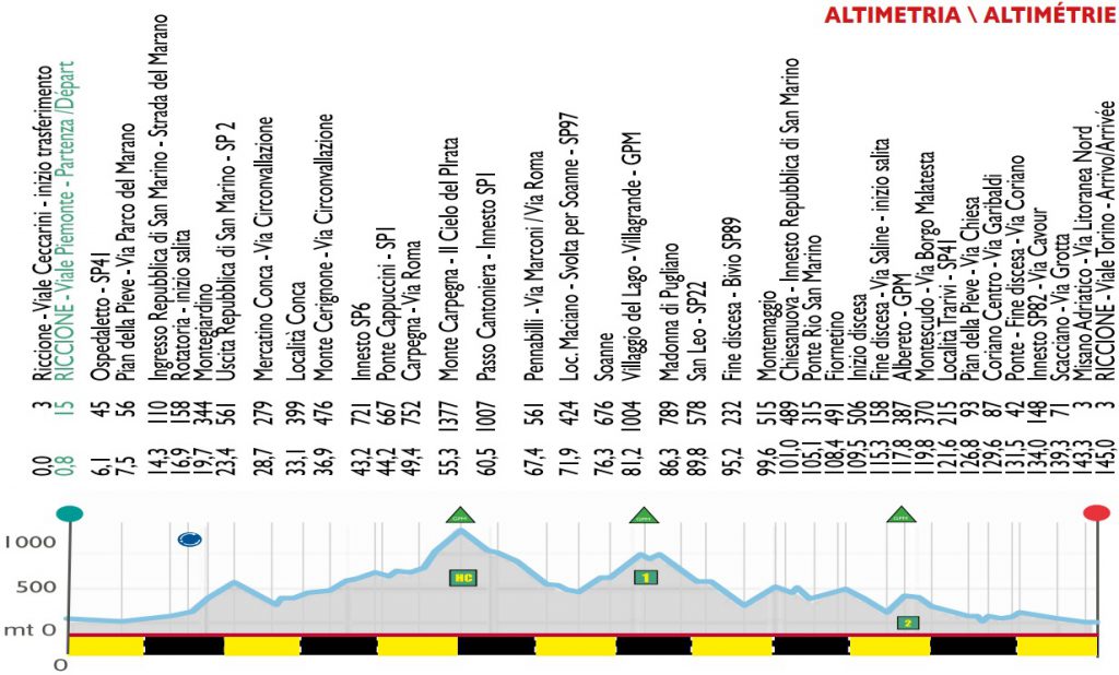 La tercera jornada de esta prueba de categoría 2.1, se cumplirá este jueves con partida y arribo en Riccione sobre una distancia de 145 kilómetros. Jornada que en la parte intermedia del recorrido presenta tres dificultades montañosas y concluye sobre terreno llano.