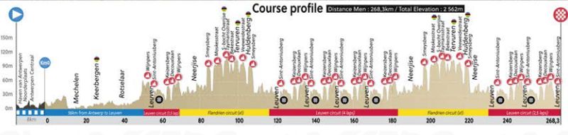 Posteriormente darán un giro al circuito de Flandes, que tiene 6 cotas montañosas, para desviarse de nuevo hacia el circuito de Lovaina, al que darán otras cuatro vueltas. Los últimos 80 kilómetros de carrera estarán compuestos por una vuelta y media al circuito de Flandes y otras dos y media al de Lovaina antes de concluir la prueba.