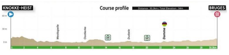 Las contrarrelojistas, que partirán del balneario Knokke-Heist, recorrerán 30,3 kilómetros hasta brujas sobre terreno llano con tan solo 50 metros de desnivel.