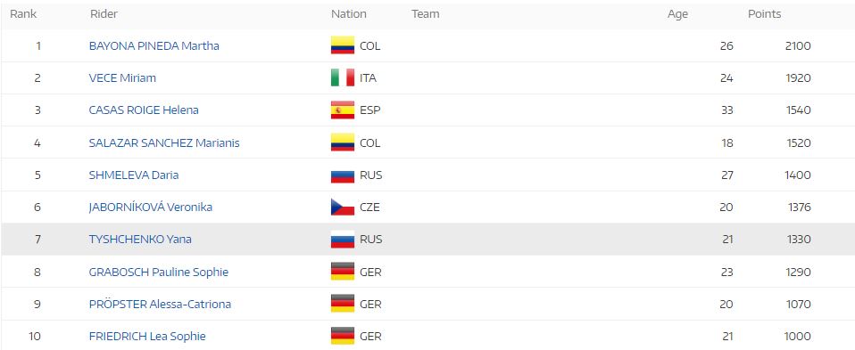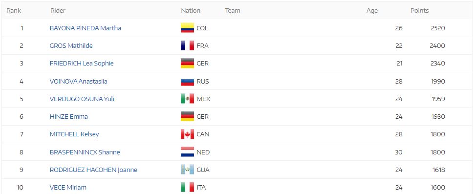 Y en la clasificación individual de CRI 500 metros, la pedalista colombiana encabeza el escalafón a con 2.100 puntos, superando por 180 puntos a la italiana Miriam Vece, segunda con 1.920 puntos, y en 560 a la española Helena Casas, tercera con 1.540 puntos.