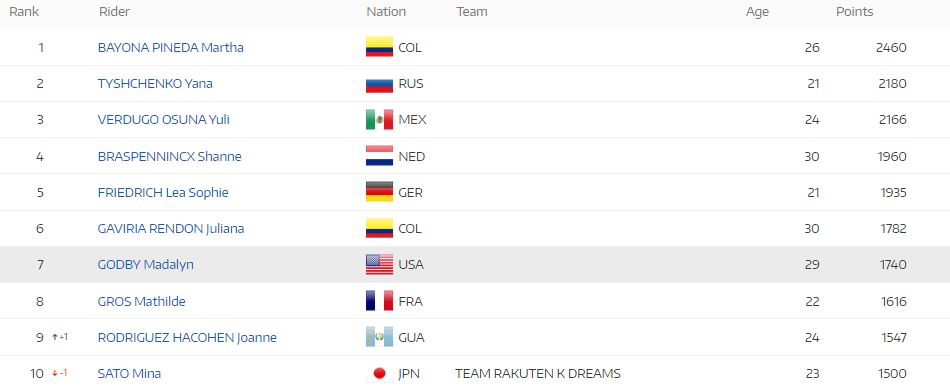 En la clasificación individual de keirin, Bayona también aparece primera con 2.460 puntos, superando por 280 puntos a la rusa Yana Tyshchenko, segunda con 2.180 puntos, y en 294 a la mexicana Yuli Verdugo, tercera con 2.166 puntos.