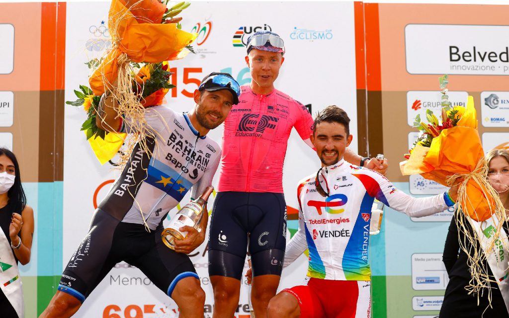 El pedalista danés derrotó nada menos que a Sonny Colbrelli, después de un sprint cuesta arriba sobre un trazado de 210,8 kilómetros con salida y llegada en la localidad italiana de Peccioli. El tercer escalón del podio fue para el francés Mathieu Burgaudeau (TotalEnergies).