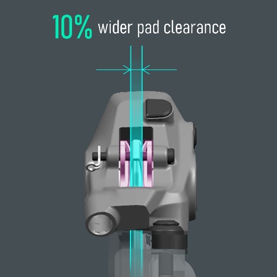 Además, la reducción del ruido de los frenos se ha mejorado mediante un 10% más de holgura del rotor y las pastillas de freno y un cambio hacia los rotores RT-MT900 de Shimano. El resultado es un sistema más silencioso, logrado gracias a una menor deformación térmica del rotor y una menor interferencia temporal entre la pastilla y el rotor.