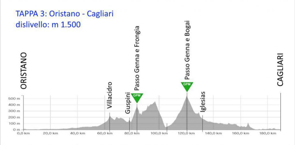 Cagliari será el punto de partida y arribo de las dos etapas finales, la primera de ellas y que podría ser considerada etapa reina por los 2.400 metros de desnivel, se disputará sobre 168 kilómetros, con tres ascensiones categorizadas. Mientras que la etapa final se llevará a cabo sobre 170 kilómetros y un final sobre terreno llano.