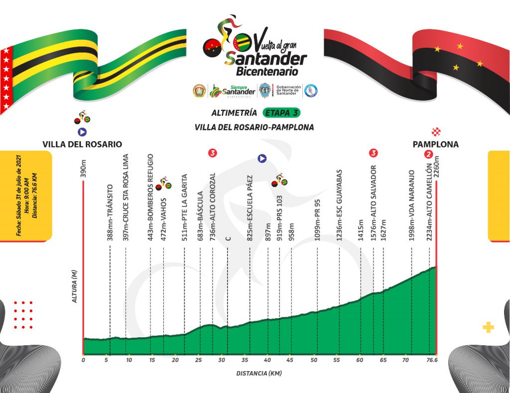 La tercera y penúltima fracción de esta prueba partirá este sábado de Villa del Rosario y recorrerá 76 kilómetros hasta la línea de meta en Pamplona, con un arribo en puerto de montaña de segunda categoría, partiendo desde los 390, para concluir sobre los 2260 msnm.