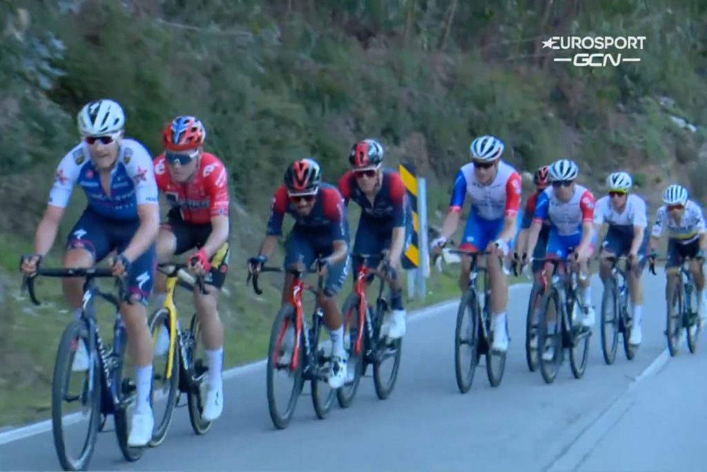 En el tramo final, la escuadra británica, con Geraint Thomas como uno de los primeros peones, marcaba el ritmo de la mayor parte de la subida. Solo a cinco kilómetros de la meta, Quick-Step-Alpha Vinyl tomó el relevo con Louis Vervaeke. Luego fue Stefan Küng, quien asumió el mando de su líder David Gaudu.