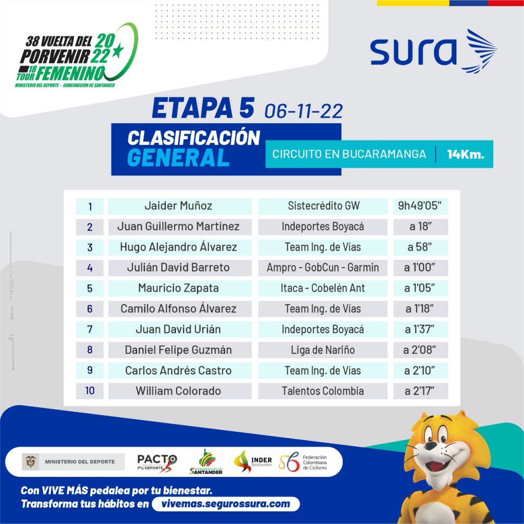 En la quinta y última fracción, disputada con un circuito este domingo en la llamada “Ciudad Bonita”, y donde se impuso el bogotano Jesús Daniel Cárdenas (Talentos Colombia – Bicicletas Strongman), Jaider Muñoz rodó tranquilo y apoyado por su equipo, llegando en la úndecima posición con sus rivales y conservando así el liderato sin ningún problema.