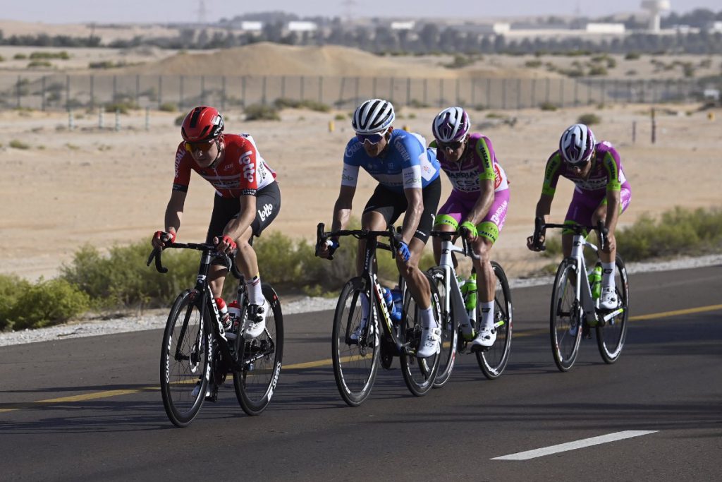 Poco después de la salida en Madinat Zayed, la ventaja de los cinco líderes aumentó a más de cuatro minutos. Los equipos de velocistas, especialmente el BikeExchange-Jayco y el Quick-Step-Alpha Vinyl, no dejaron que la diferencia fuera mucho mayor. Durante mucho tiempo, la brecha fluctuó entre dos y cuatro minutos.