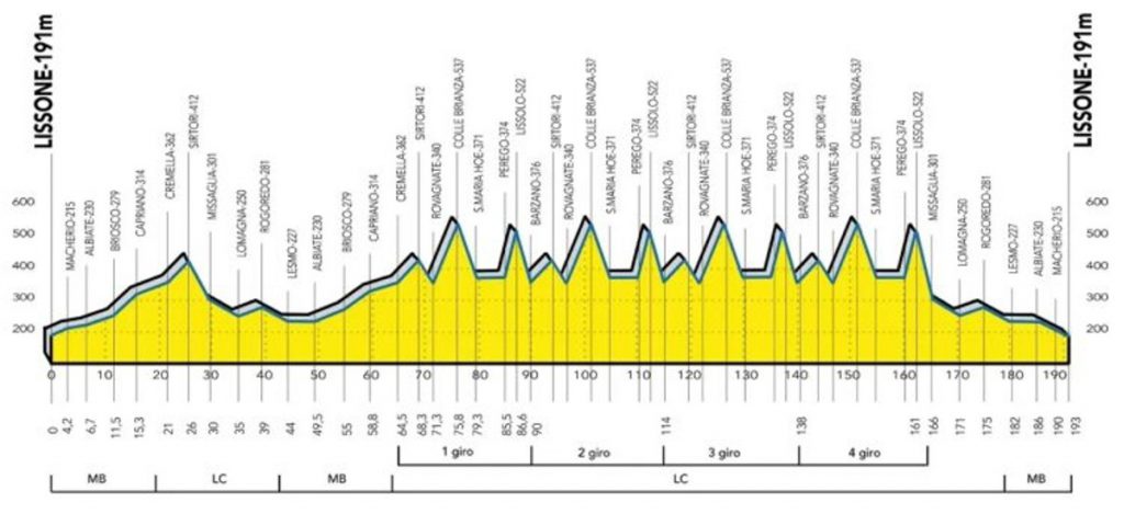 La clásica italiana cuenta con un recorrido montañoso de 193 kilómetros. La carrera iniciará con un pequeño repecho, con un primer tramo en línea de unos setenta km, pasando dos veces la cota de Sirtori (1600 metros al 5%), y cuatro vueltas a un exigente circuito con Colle Brianza (3 km al 6,5%) y Lissolo (2,4 km al 7,5%). La última de esas ascensiones se corona a 32 kilómetros de la meta.