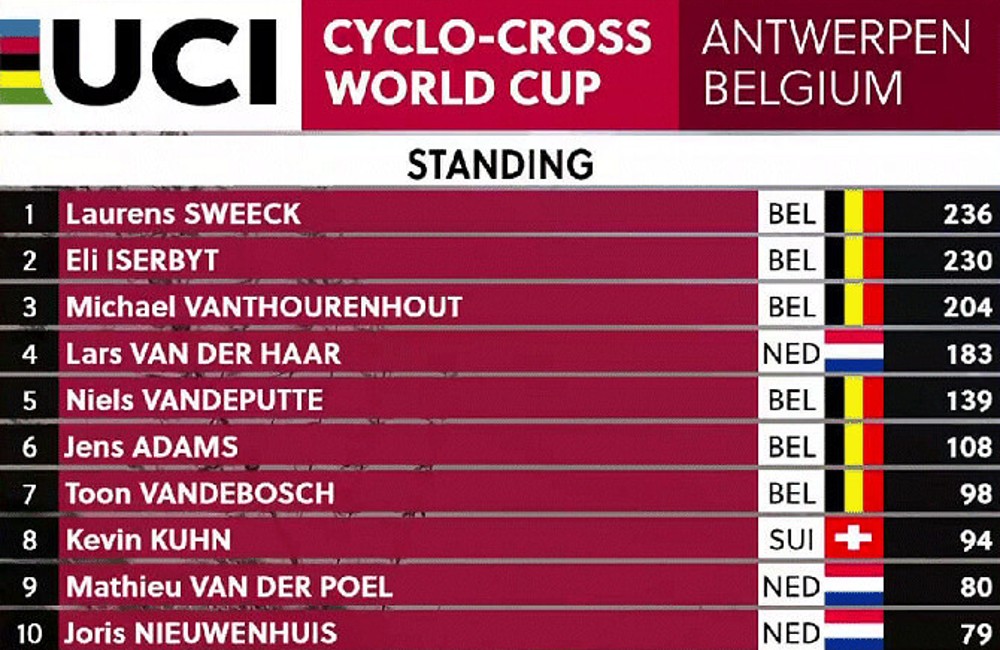 En la clasificación general de la Copa del Mundo de ciclocrós el belga Laurens Sweeck domina con 236 puntos frente a los 230 de sus compatriotas Eli Iserbyt y de los 204 de Michaël Vanthourenhout.