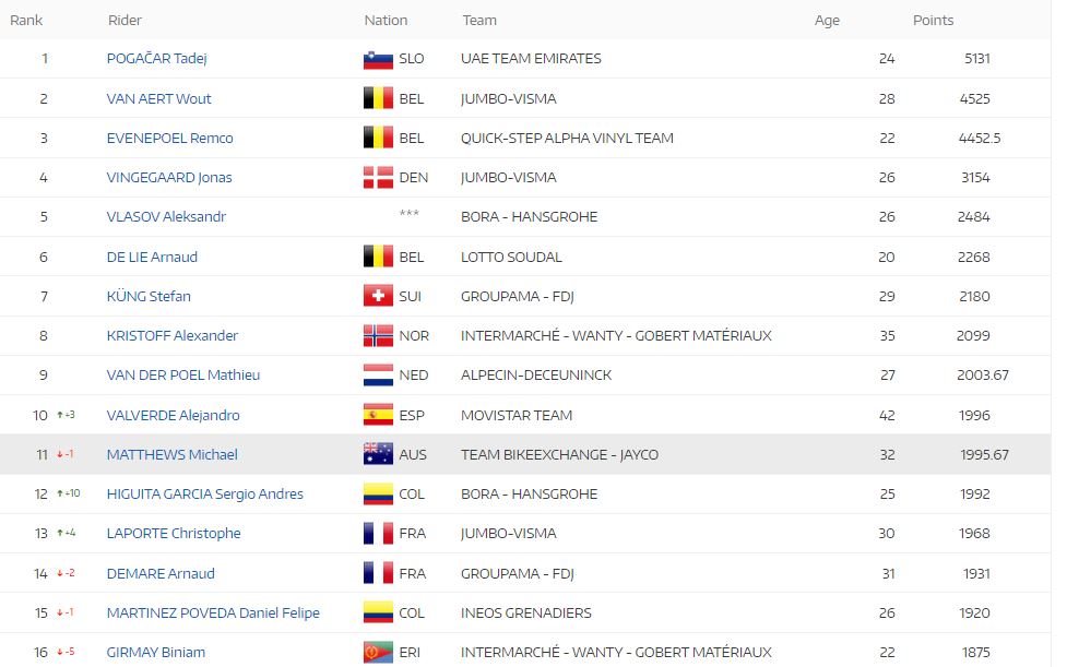 Completaron las primeras cinco posiciones Jonas Vingegaard(Jumbo Visma) y el ruso Alesandr Vlasov (Bora-Hansgrohe). Stefan Küng 6° (Groupama-FDJ), Arnaud De Lie 7° (Lotto Soudal), Alexander Kristoff 8º, (Intermarché-Wanty-Gobert) y Mathieu Van der Poel (Alpecin-Deceuninck), 9° se ubicaron en el top 10.