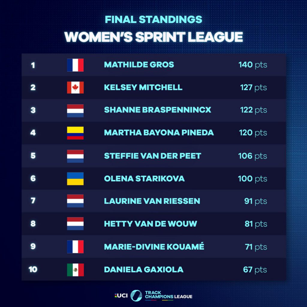 La santandereana cerró su participación en el torneo, tras llegar a la semifinal del sprint, y sumar un total de 120 puntos en las cinco paradas del evento, puntaje que le permitió ubicarse en la cuarta posición de la clasificación general del sprint, en tabla liderada por la campeona mundial francesa Mathilde Gros, quien se llevó el título del evento, tras superar en el acumulado a la canadiense Kelsey Mitchell, segunda con 127, y a la neerlandesa Shanne Braspennincx, tercera con 122.