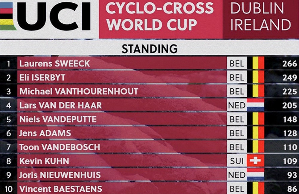 En la clasificación general de la Copa del Mundo de ciclocrós el belga Laurens Sweeck domina con 266 puntos. Lo escoltan sus compatriotas Eli Iserbyt (Pauwels Sauzen-Bingoal) y Michaël Vanthourenhout (Pauwels Sauzen-Bingoal).