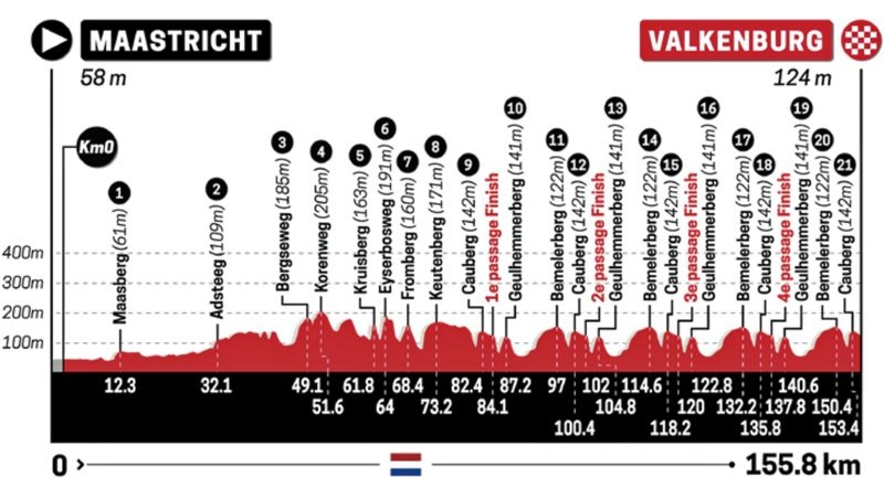 Para este año el recorrido entre Maastricht y Valkenburg consta de 155,8 km con una vuelta extra -serán un total de cuatro- a un circuito que tendrá como clave Valkenburg, con las subidas a Geulhemmerberg, Bemelerberg y, sobre todo, el Cauberg, a 2 km de la meta de Berg en Terblijt.