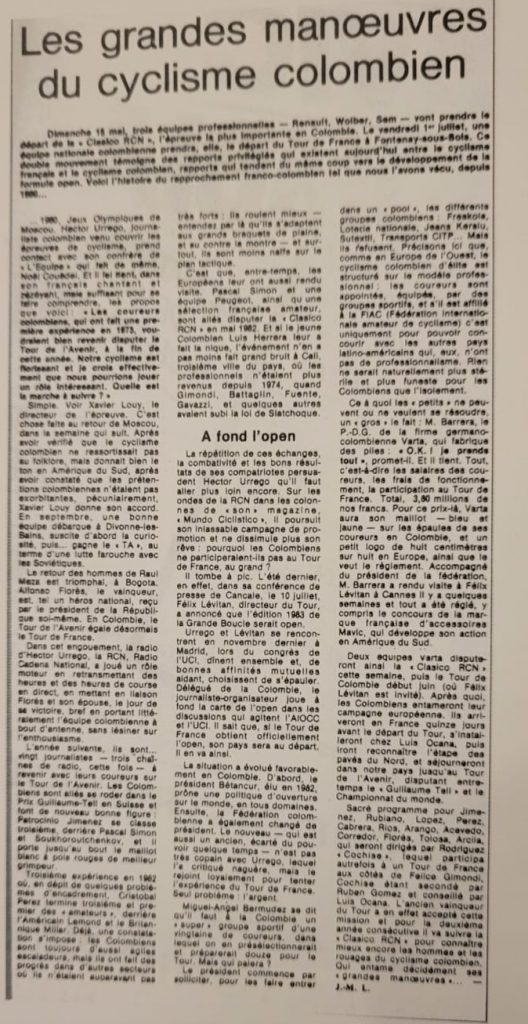 Nadie mejor que el periodista francés Jean Marie Leblanc para describir lo que siguió inmediatamente para el ciclismo. Esto nos permite para transcribir los apartes mas destacados de la segunda parte del artÍculo que él escribió en L´Equipe, en junio de 1983 titulado “Las Grandes Maniobras del ciclismo colombiano” antes de iniciar un Tour de Francia para la historia.