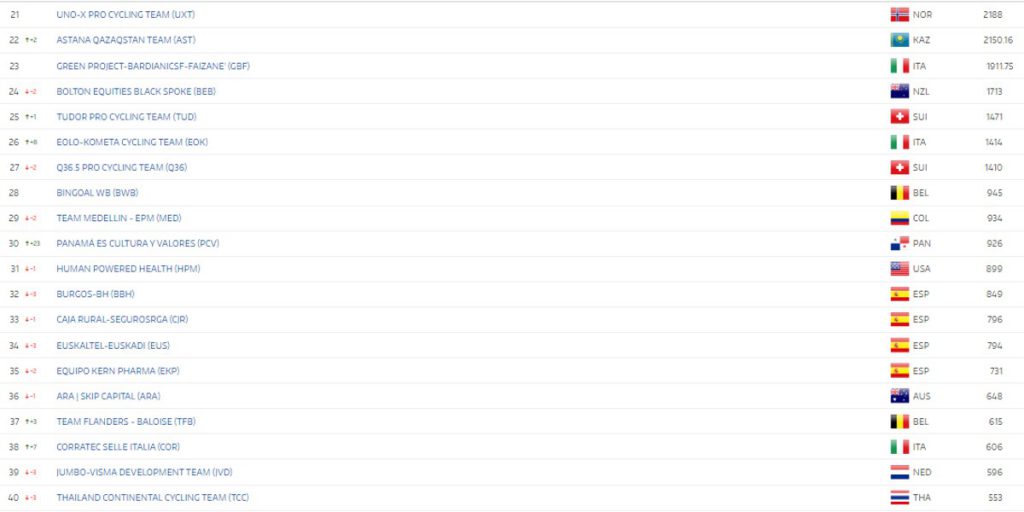 Una vez concluida la primera grande de la temporada, la Unión Ciclista Internacional actualizó el ranking mundial de equipos. El conjunto colombiano Team Medellín-EPM se ha consolidado como la mejor escuadra continental del escalafón mundial en la casilla 29° con un total de 934 puntos, gracias a las actuaciones destacadas de Miguel Ángel Supermán López y de Óscar Sevilla, principalmente.
