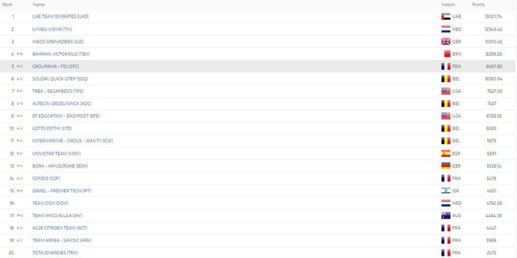 Con los resultados computados del Giro de Italia, el UAE Team Emirates se encuentra en la primera posición con 13.001 puntos, el Jumbo-Visma le sigue de cerca con 12.349 puntos. En el tercer puesto aparece el Ineos Grenadiers, un poco descolgado de los dos punteros con 10.310 puntos.