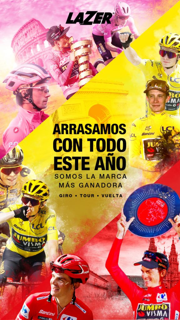 Tras la victoria de Primoz Roglic en el Giro de Italia y la victoria de Jonas Vingegaard en el Tour de Francia, el Team Jumbo-Visma completó una trilogía única con la victoria final de Sepp Kuss en la Vuelta a España. Por primera vez en la historia del ciclismo, un mismo equipo gana las tres grandes vueltas en la misma temporada llevando consigo la marca LAZER en cada triunfo.