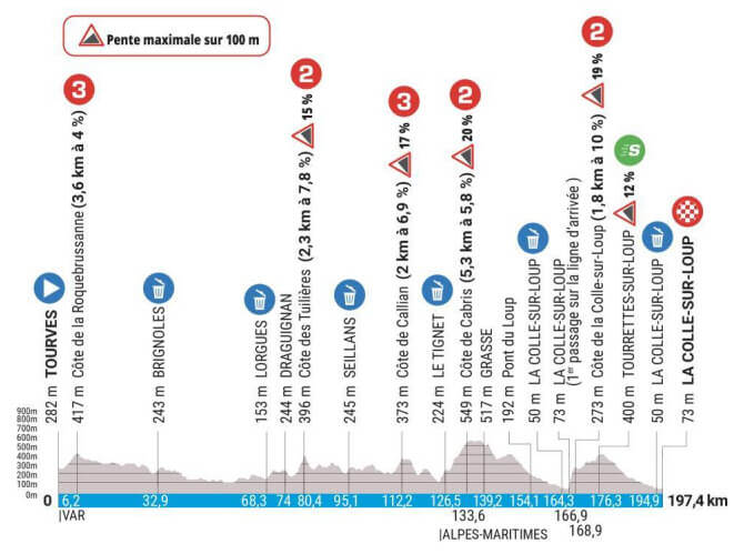 La ronda francesa continuará este viernes con la sexta jornada, una fracción de media montaña con 197,4 kilómetros que se correrá desde Tourves hasta La Colle-sur-Loup con cinco premios de montaña, dos de tercera categoría y tres de segunda.
