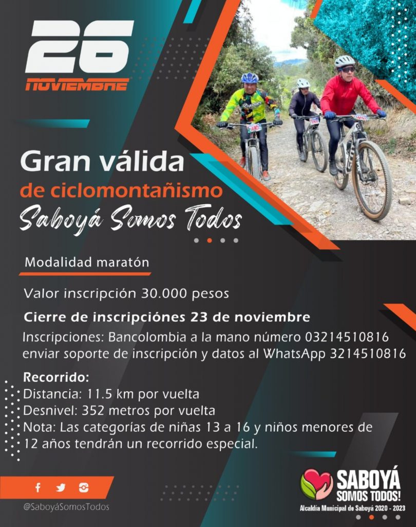 El próximo domingo 26 de noviembre en el Parque Principal dell municipio de Saboyá se llevará a cabo la Gran Válida Formativa de Ciclomontañismo, en la modalidad Maratón, en alianza con la Alcaldía de Saboyá, Boyacá. El recorrido tendrá un circuito de 11,5 kilómetros por vuelta y con un desnivel de 352 metros por vuelta en el Occidente boyacense.
