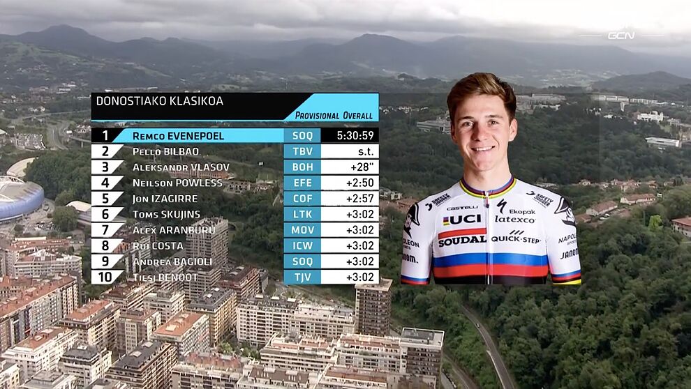 Con la meta acercándose en el horizonte, Pello Bilbao se armó de valor e intentó contraatacar al prodigio belga en el segundo paso por Murgil provocando la respuesta de Remco pero soltando al ruso que no pudo aguantar el ritmo. Animado a rabiar por su afición, Bilbao intentó la hazaña pero el ex lateral izquierdo de Anderlecht, PSV Eindhoven y la selección belga Sub 16 no dio lugar a sorpresas y se llevó su tercera victoria en la Klasikoa tras los títulos de 2019 y 2022.